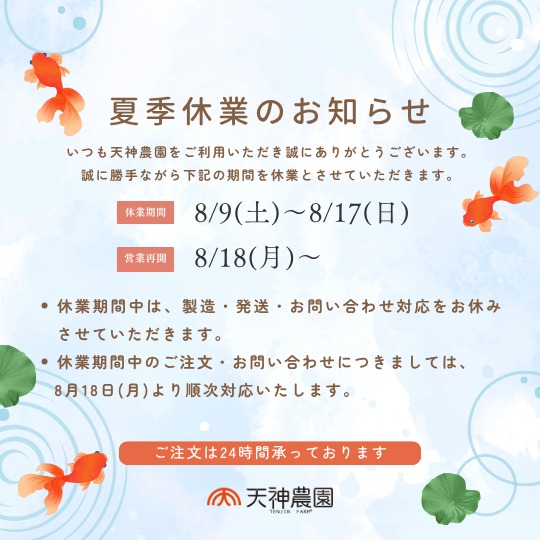 休業期間中のご注文・お問い合わせにつきましては8/18(月)より順次対応いたします。